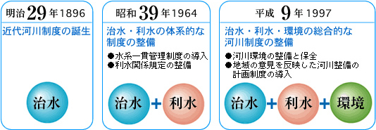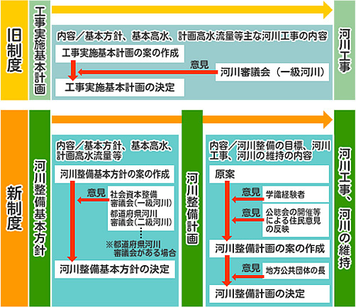 国土交通省では、平成9年の河川法改正に伴い、「河川整備基本方針」、「河川整備計画」を