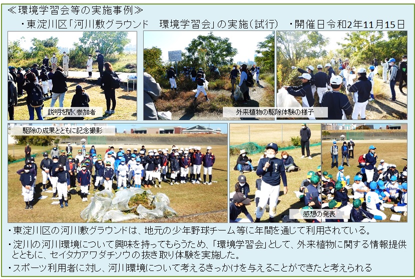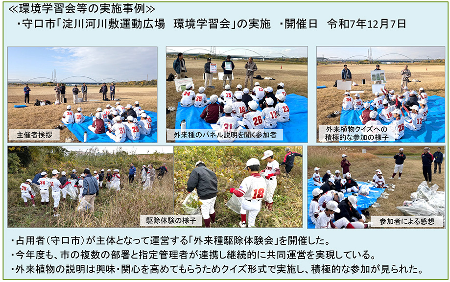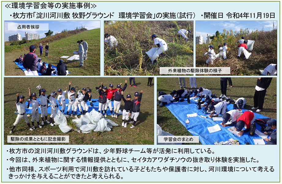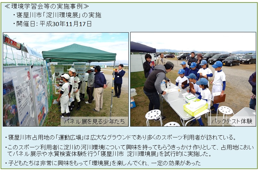 河川保全利用委員会では、淀川水系河川整備計画に掲げられた「川に活かされた利用」を推進しており、その取組事例として、占用者主催による利用者(特にスポーツ利用者など)を対象とした河川環境学習会開催を推奨しています。