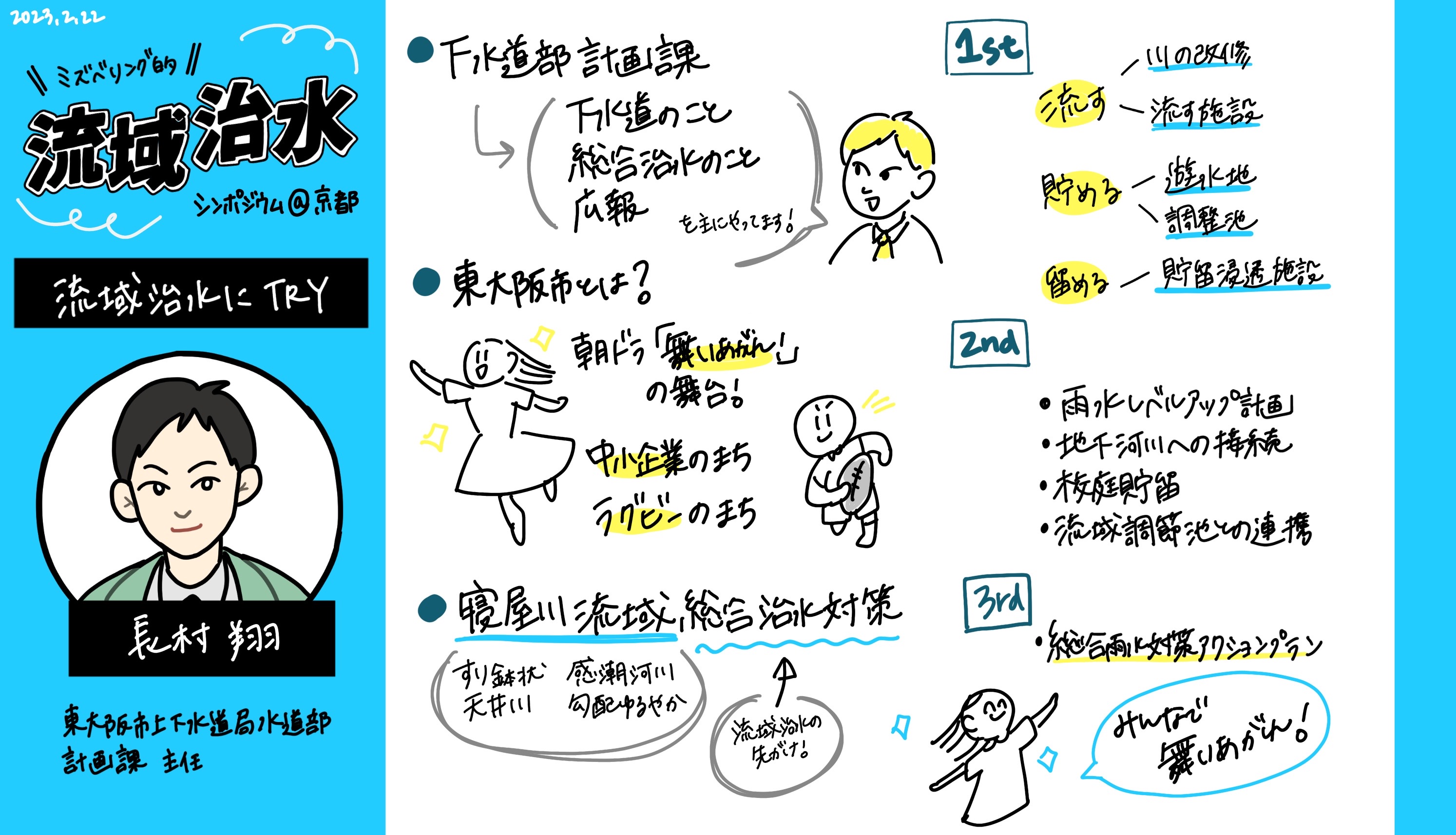 住民も含めた流域に関わるあらゆる関係者が水害に強いまちづくりを進める「流域治水」と、水辺をつくり育てる、水とまちの未来創造プロジェクト「ミズベリング」を掛け合わせた「ミズベリング的流域治水」として流域治水を身近に楽しく考えていただき、淀川流域の防災・減災につなげることを狙い、2023年2月22日にシンポジウムを開催いたしました。