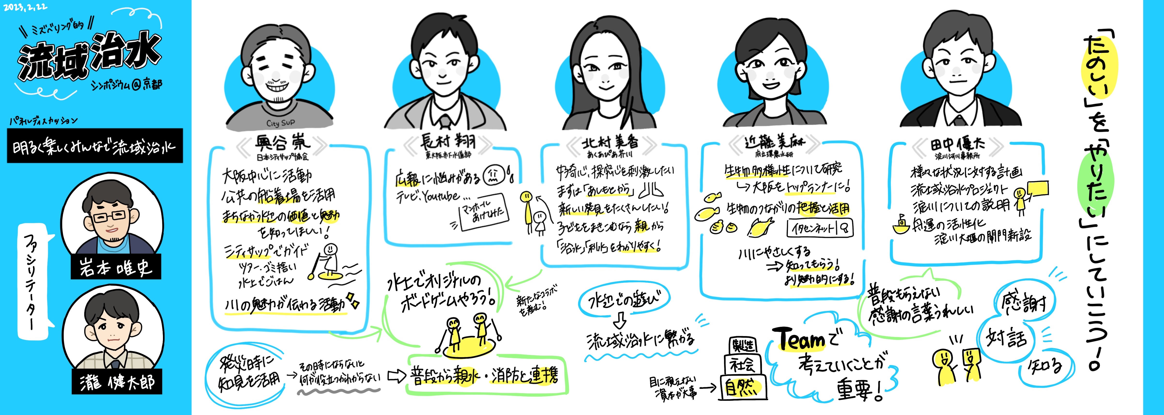 キーワード:ミズベリング、流域治水、SUP、水辺での遊び、学芸員、紙芝居、生物多様性、イタセンパラ、生き物調査、川に優しく、河川管理者、淀川大堰、舟運活性化、親水、消防と連携、感謝、対話、知る