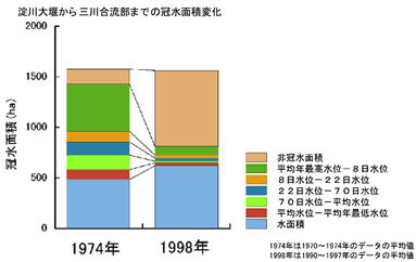 淀川では、平常時に水が流れる低水路の部分を拡幅して水を流せるように改修をおこなったことから、高水敷は冠水頻度が減ってしまい、完全な陸上となってしまいました。