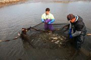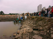 具体的には、魚貝類の生息状況の実態調査とともに、わんどを締め切ってポンプで水をくみ出し、水位をさげることでわんどの底を干し上げ、さらにゴミの除去や貝類の生息に配慮した浅場づくりを行いました。