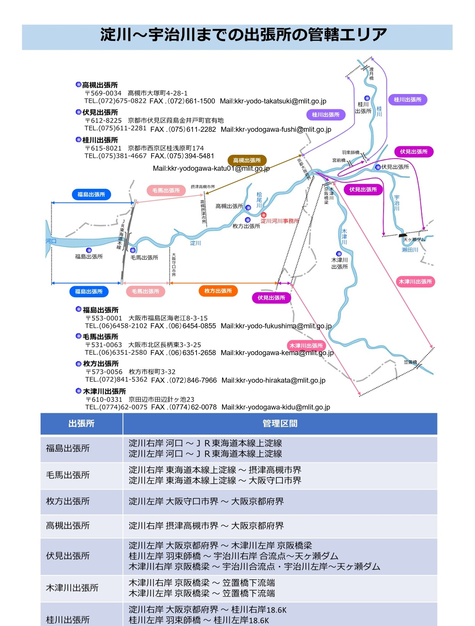 | 桂川出張所 | ・羽束師橋右岸下流付近 ・久我橋左岸下流付近 ・松尾橋左岸下流付近 |