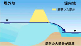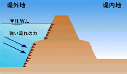 低い水位でも、長期にわたる洪水により、河川の水が堤防にしみわたり、堤防の強度が低下し、川裏(住宅のある方)の堤防が崩れる現象