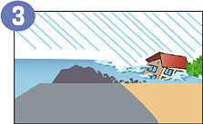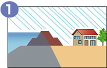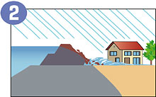 堤防を押しくずして、水が一気に街側に流れ出る。