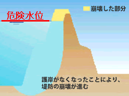 堤防本体もしくは堤防前面にある高水敷(いわゆる河川敷)が削り取られること。