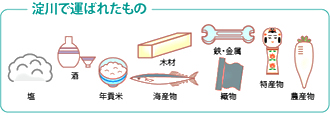 淀川は、奈良・平安時代には、遣唐使が都から出発する際に通行するなど、東アジア各地へと繋がる交通路として、国や地域間の物流や交流を支えてきました。 また、江戸時代には、大阪は「天下の台所」として栄えました。縦横に流れる川が、物流ネットワークとして機能し、淀川沿い(現在の大川・中之島付近)には、諸藩の蔵屋敷が建ち並びました。全国から大阪に集まった物資や物産は京の都へ、都の文物は大阪へと運ばれました。塩や酒に加え、年貢米、木材、全国各地の特産物といった貴重な物資の輸送路として活用された淀川は、経済の大動脈としての役割を果たしていました。