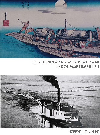 江戸時代、淀川には、大阪と京都・伏見を結ぶ交通手段として旅客専用の三十石船が登場しました。米を三十石積めることから三十石船と呼ばれたこの船は、全長約17m、乗客定員約28人で、曳き船が必要な上りは約12時間、川の流れに乗れる下りは約6時間で大阪と京都・伏見を結びました。三十石船は、スピードが売り物で、最盛期には、「早上り三十石」「早船三十石」と呼ばれ、上り下り合わせて一日320便、およそ9000人が往来したといわれています。その旅客に、「飯くらわんか、酒くらわんか」などと叫びながら近づき、酒や食べ物を売っていたのが「くらわんか船」で、その荒っぽい河内弁は、淀川の名物でもありました。(「くらわんか」とは河内弁で「食べませんか?」のことです。) 明治時代に入ると蒸気機関を備えた外輪船が導入され、貨物や旅客の輸送量が飛躍的に増加しました。外輪船は最盛期には14隻が就航し、大阪・八軒家(天満橋付近)と京都・伏見の間を、上りは6時間、下りは3時間半で結びました。