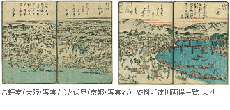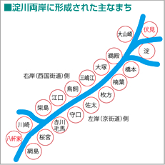 江戸時代、淀川の恩恵を受けて、淀川両岸のまちが発展していきました。 当時の船の航路となっていた伏見から大阪・八軒家まで、左岸側に京街道、右岸側に西国街道などがあり、街道沿いは宿場町として発展しました。伏見は、京都の入り口であり、京都・奈良・大阪を結ぶ水路・陸路の要、城下町として機能していました。京都と大阪のほぼ中間点にある枚方は、淀川舟運の中継港、また京街道の宿場町としてにぎわいました。