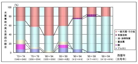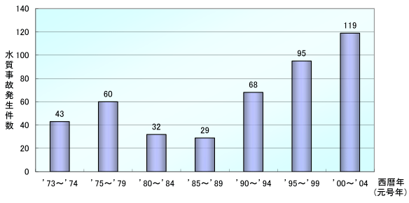 水質事故の発生件数は、1980年代に一度低下いたしましたが、近年では、その約4倍に増加しています。(図10)