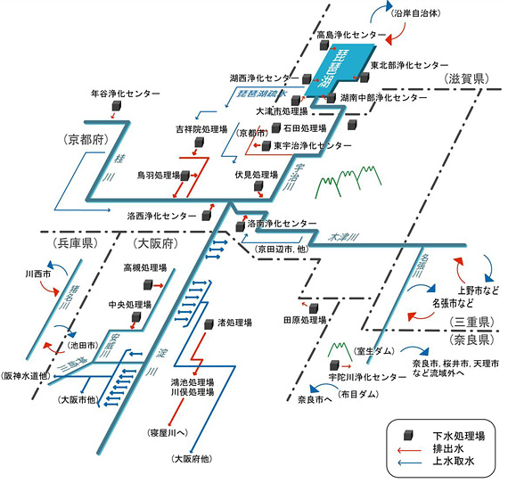 三川合流点より下流の下水処理場では、下水処理水を淀川以外に放流していますが、上流の下水処理場では桂川・宇治川・木津川に放流しており、淀川における上水取水は、これらの影響を受けざるをえない状況にあります。