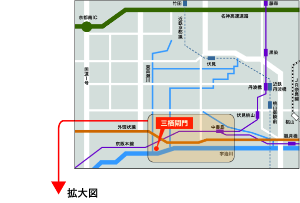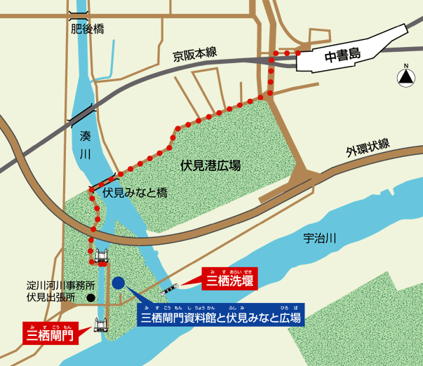 資料館には駐車場はありません。 伏見観光協会による「十石舟」「三十石船」が宇治川派流を運航しており、三栖閘門にて下船できます。 運航に関する詳細は、伏見観光協会HP http://kyoto-fushimi.or.jp/ship/ で確認して下さい。 |