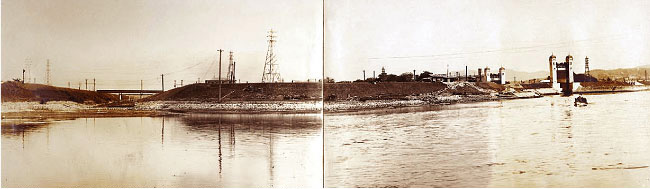 完成当時の三栖閘門と東高瀬川(宇治川から撮影)1929年(昭和4)