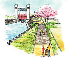 この計画に基づいて閘門の補修を行い、人びとが伏見の歴史・文化を語り継ぐための施設を多彩に配置し、憩いの水辺として整備しました。