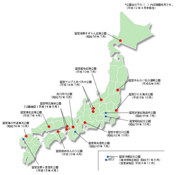 いわゆる「公園」は、大きく分けて都市公園に代表される営造物公園と、国立公園に代表される地域制公園があります。国営公園は国が整備、管理する都市公園です。国営公園はその趣旨により、以下のふたつの種類があります。
