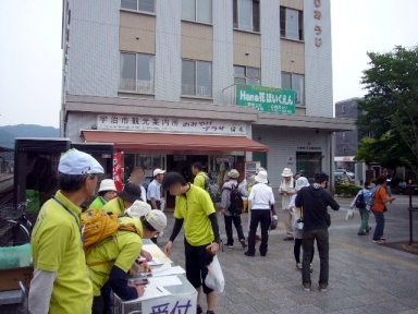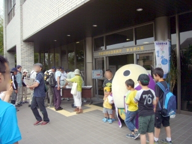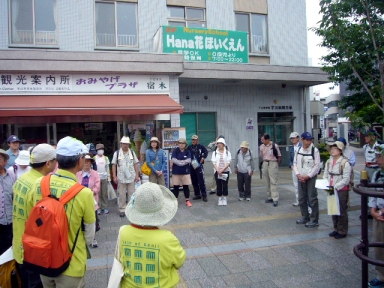 集合場所のJR宇治駅には、朝早くからたくさんの参加者が集まり、コースや注意事項の説明の後、9時35分に出発。宇治観光ボランティガイドを先頭に宇治橋通り沿いを散策しながら、まずは宇治浄水場(京都府営水道事務所)を目指しました。