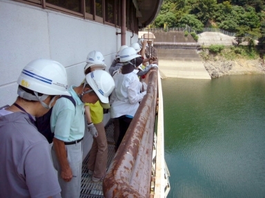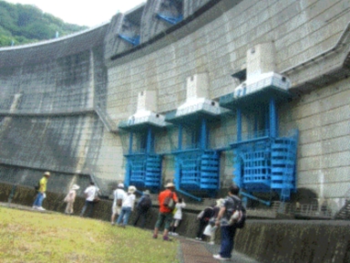 天ヶ瀬ダムはドーム型アーチ式ダムといって、ちょうど貝殻を立てたようにダム全体が下流側へ迫っています。天ヶ瀬ダムを減勢池から見上げるとダムが見る者に迫って来るように見えます。参加者はその大きさやアーチダム特有のフォルムの美しさに驚いていました。